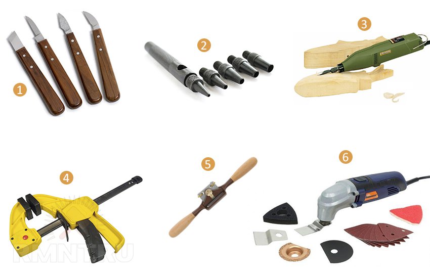 1 — ножи для резьбы по дереву; 2 — пробойники; 3 — электростамеска; 4 — быстрозажимная струбцина; 5 — стружок; 6 — реноватор