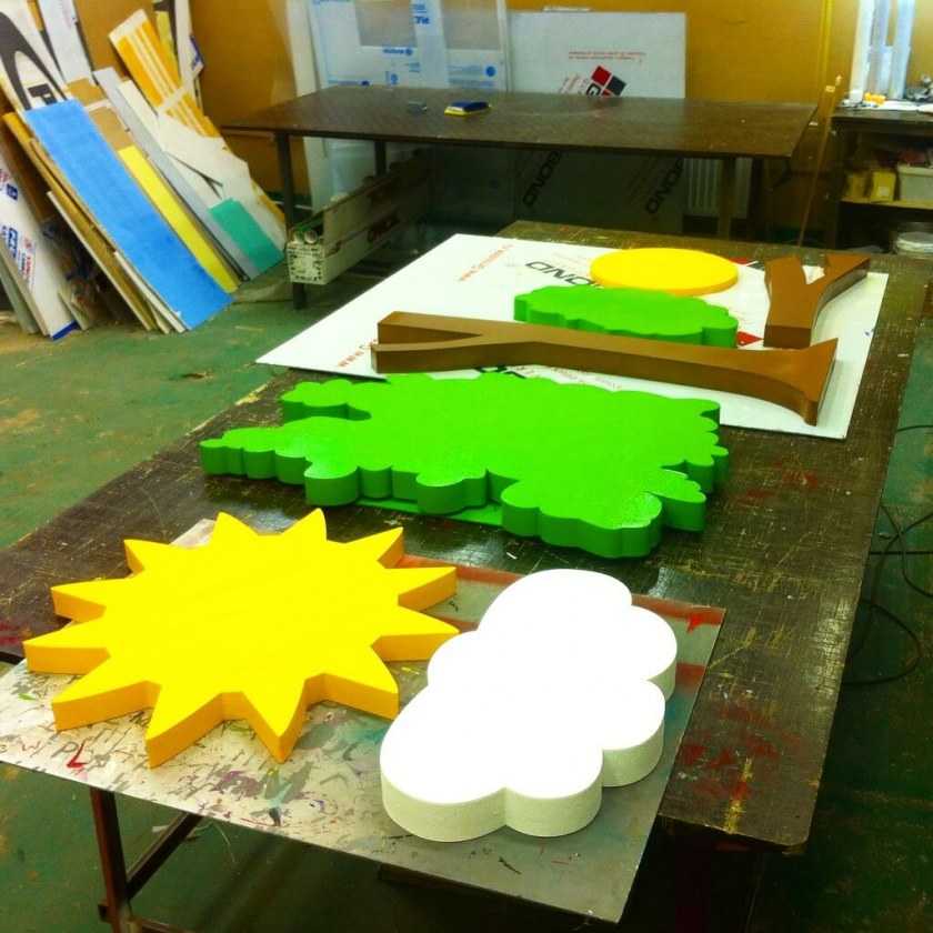 Подойдёт пенопласт толщиной от 1.5 см и больше. Лучше использовать равные листы, купленные специально для поделки в строительном магазине. С помощью линейки и фломастера на пенопласте рисуют контуры букв. Затем их вырезают канцелярским ножом и убирают все неровности наждачной бумагой.