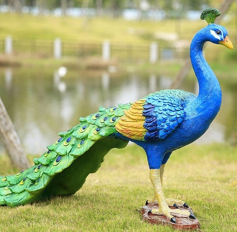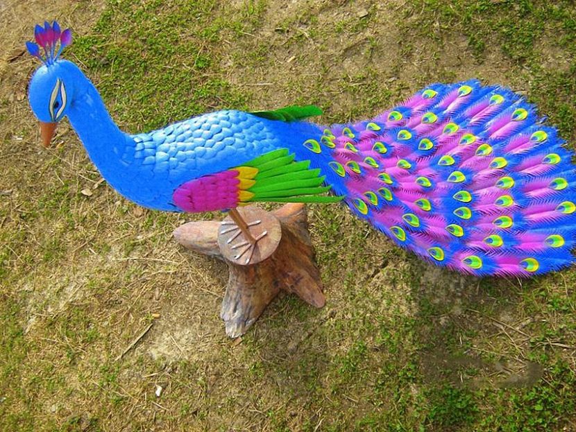 Красивый яркий павлин превосходно впишется в дизайн любого сада или дачного участка. В данном случае он изготавливается по тому же принципу, что и предыдущие поделки. Особенность в том, что для формы тела используется объемный кусок пенопласта, а для создания хвоста — плоский. Далее хвост прочно фиксируется к туловищу, наносится шпатлевка в 3 слоя, шлифуется, раскрашивается краской и покрывается акриловым лаком. Павлин готов украсить дачный участок.