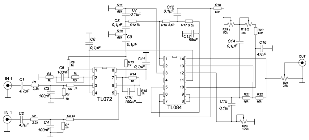 Стерео сигнал подается на разъем In через C1 (100nF) и R1 (2,2 М) на первом канале и C2 (100nF) и R2 (2,2 М), в другом канале. Затем он поступает на вход операционного усилителя U1A (TL074). Потенциометром P1 (220k), работающем в цепи обратной связи усилителя U1A, выполняется регулировка усиления всей системы. Далее сигнал подается на фильтр второго порядка с элементами U1B (TL074), R3 (68k), R4 (150к), C3 (22nF) и C4 (4,7 nF), который работает как фильтр Баттерворта. Через цепь C5 (220nF), R5 (100k) сигнал поступает на повторитель U1C, а затем через C6 (10uF) на вход усилителя U2 (TDA2030).