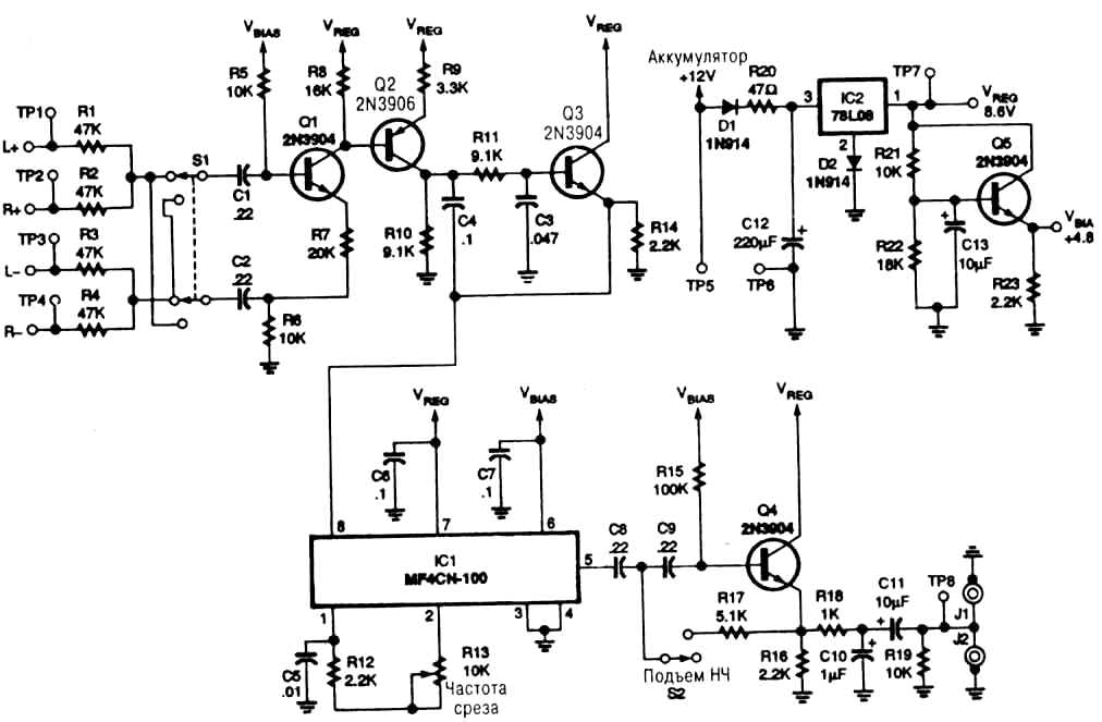 Недостатком данной схемы можно считать отсутствие плавной регулировки полосы пропускания, но для работы звукового комплекса это не так важно