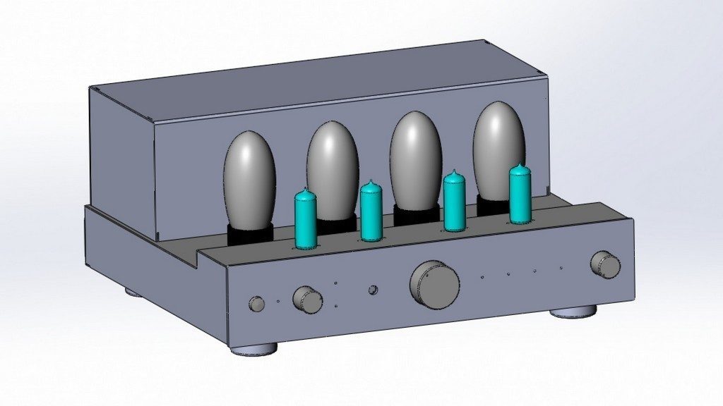 Как оказалось, изготовить приятный внешне и подходящий по всем параметрам корпус для лампового усилителя задача нетривиальная. Стенки корпуса должны быть толстыми, чтобы не прогибаться под многокилограммовыми трансформаторами, коих аж 5 штук. Отверстия под лампы, разъемы и переключатели должны быть рассчитаны и вырезаны с точностью до миллиметра. А еще нужны внутренние экраны, щели вентиляции и т.д. В результате пришлось создавать 3D-модель, чтобы все детали можно было согласовать окончательно.