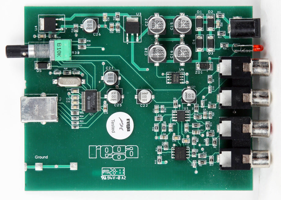 Фонокорректор собран в совсем миниатюрном корпусе. Внешне все аккуратно и даже аскетично. Один вход, предназначенный только для подключения ММ-головок, один выход, выносной блок питания, маленький и неяркий светодиодный индикатор, расположенный на задней панели. Никаких настроек не предусмотрено. Но есть и одна особенность — в корпус, помимо ММ-фонокорректора, встроен еще и аналого-цифровой преобразователь с регулировкой уровня. В тесте эту функцию я оценивать не буду, но раз она есть, о ней нужно упомянуть. Да и в некоторых случаях встроенный АЦП может быть востребован, например, для записи любимых пластинок для последующего прослушивания на портативной аппаратуре. Для качественных оцифровок, конечно, нужна более серьезная техника, но мы-то рассуждаем о бюджетных вариантах. Внутри все собрано на одной плате, примерно половину занимает фонокорректор, а вторая половина приходится на АЦП. Схема очень простая, с использованием операционных усилителей. Детали скромные, монтаж аккуратный.