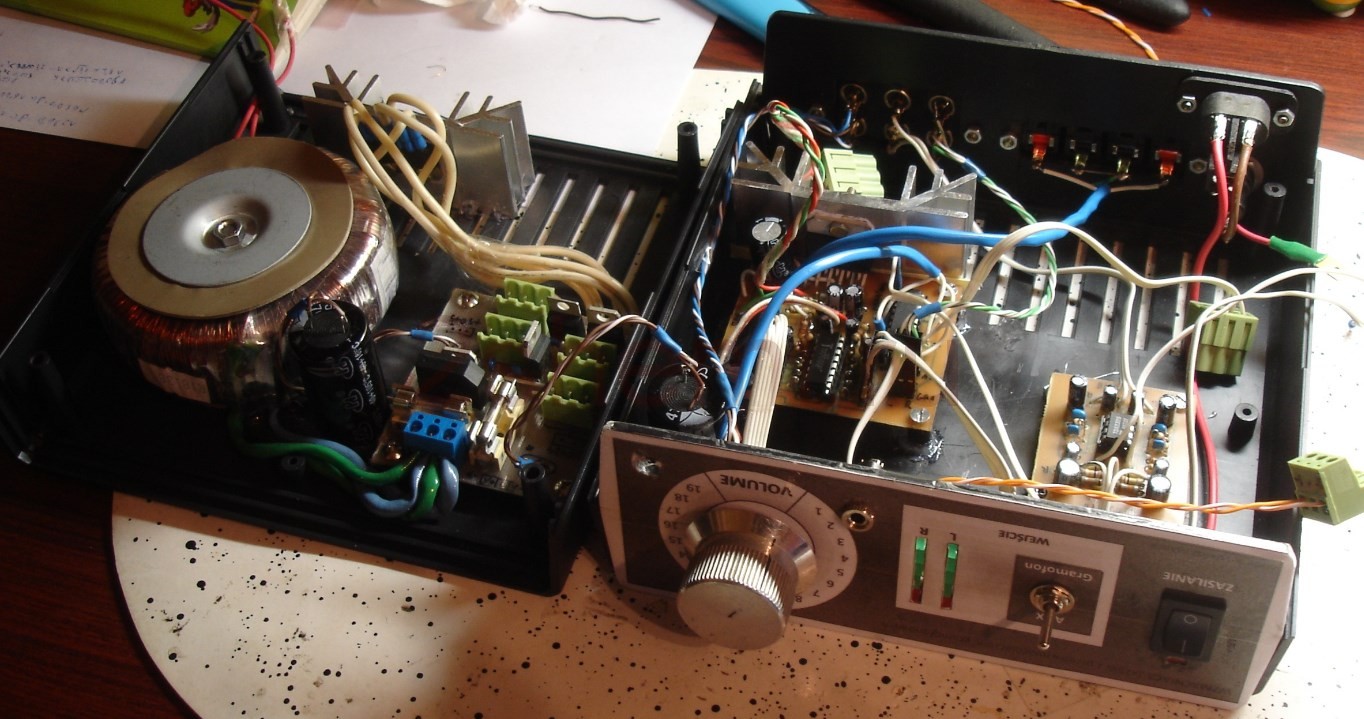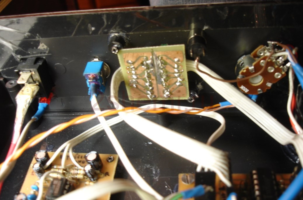 Осталось добавить, как между собой связаны отдельные блоки, описанные выше. Предусилитель подключен к селектору входов. Выход селектора подключен к двойному линейному потенциометру 20 кОм, выход потенциометра отделен и подключен к усилителю наушников, главному усилителю, индикатору управления и линейному выходу.
