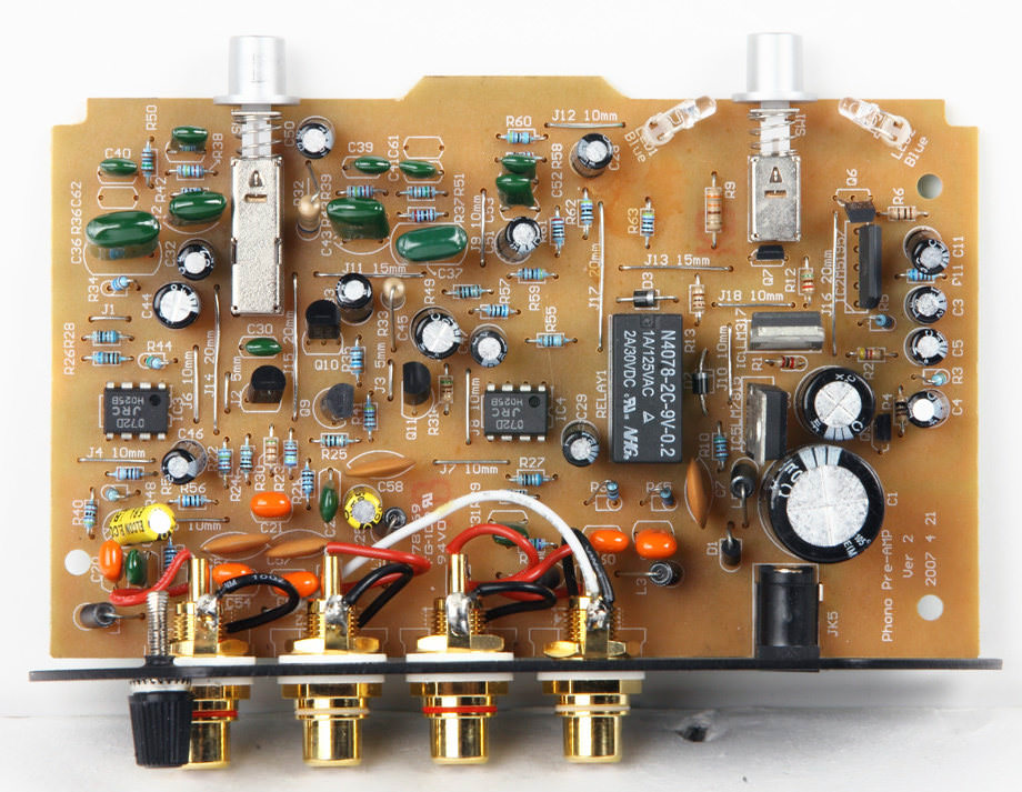 У фонокорректора небольшой, аккуратный и увесистый для своих размеров корпус. Сетевой адаптер, как и у всех остальных аппаратов в этой части теста, выносной, в виде вилке адаптера. Никаких настроек нет, только выключатель на передней панели, подсвечивающийся яркими голубыми светодиодами, и переключатель ММ/МС. Внутри вся схема собрана на одной плате, занимающей весь корпус. В плане схемотехники — ничего кардинально отличающегося от прочих участников теста. Недорогие детали, обычный в меру аккуратный монтаж, ожидаемые операционные усилители. Может быть, несколько больше внимания уделено питанию, но в целом все ожидаемо и предсказуемо.
