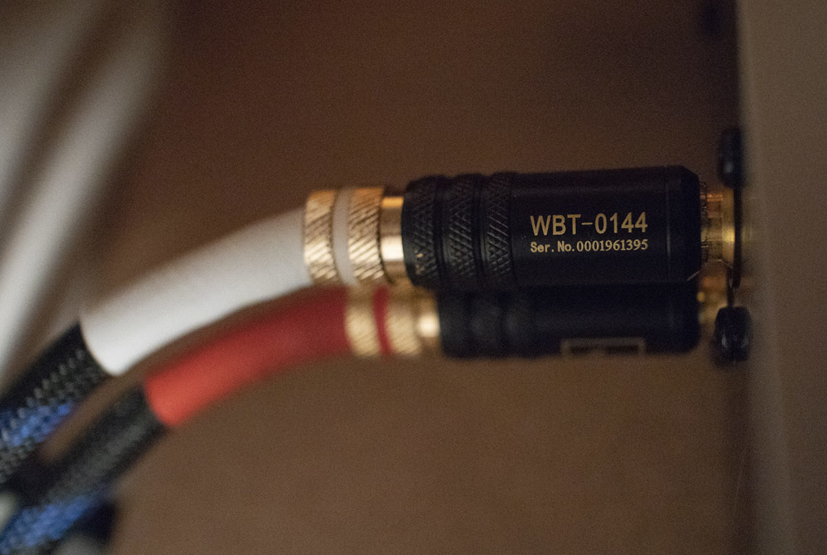 Межблочный ноунейм-кабель, соединявший фонокорректор с усилителем, был заменен на кабель DH Labs с коннекторами WBT-0144. Стоимость такого кабеля — 10 000 рублей.
