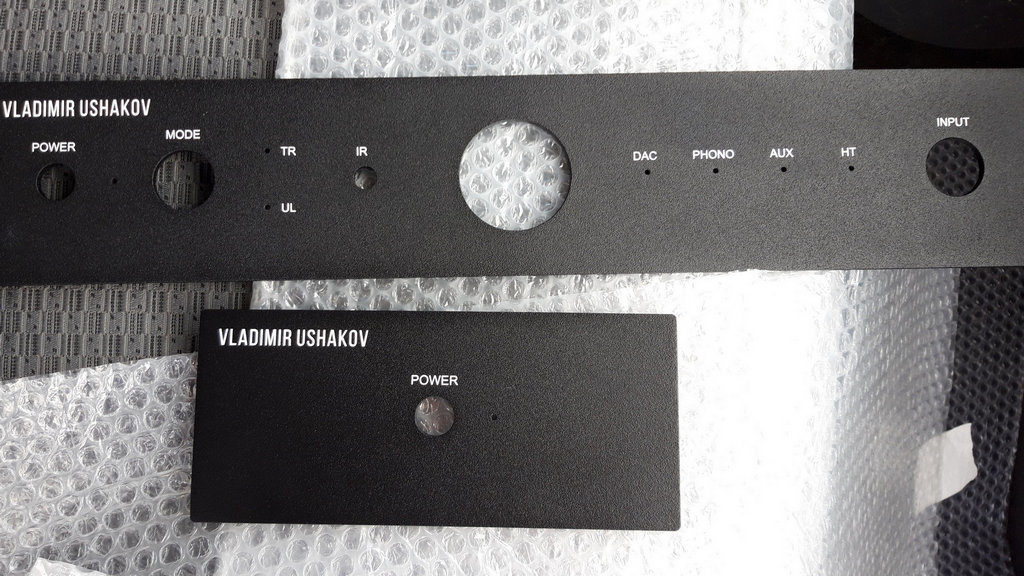 После изготовления корпуса из стали, а передней панели из алюминия, все отверстия были вырезаны с помощью лазерной резки. Дальше корпус был отдан на покраску. С фонокорректором все оказалось несколько проще. Единственное что, пришлось подгонять его внешней вид и высоту под корпус усилителя, чтобы они смотрелись в едином стиле. Для пущей красоты, ручки, ножки и прочая мелочь были заказаны готовые, на алиэкспресс.