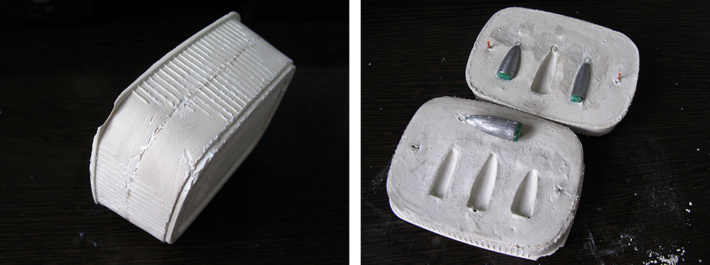 Таким образом я сделал 3 формы с разными весами. Прежде чем формы придут в негодность, отлитых в них грузиков, мне хватит на 2 или 3 сезона). Главный минус таких форм, это недолговечность. Гипс достаточно хрупкий материал, поэтому формы быстро трескаются, в них появляются каверены и сколы, особенно это касается разъемных форм. Формы для «пулек» служат гораздо дольше. Например, форма, представленная на фото в статье, служит уже второй или даже третий сезон.