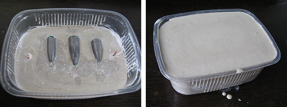 Снова разводим гипс и заливаем контейнер до верха. Также постукиванием выгоняем пузырьки воздуха и оставляем для застывания на те же 20-30 мин.
