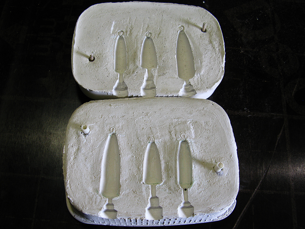 - Изделие полученное таким методом,подвергают полировке,так как гипсовая форма пропитана микро порами,их нельзя убрать пастой Гоя,можно форму, только закоптить,покрыть мелом или тальком. Сажа,мел,тальк-позволяют свободно скользить свинцу по внутренней поверхности формы и заполнять все пустоты. Эти компоненты влияют на гладкость,качество грузила и позволяют легко вынимать из формы.