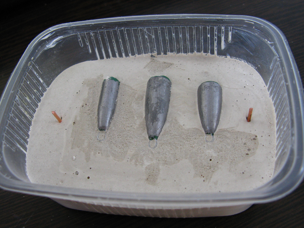 Если же за материал для грузил будет взят свинец, изготовленная форма для литья выдержит примерно 8-10 отливок. Также стоит отметить, что с каждым разом свинцовое грузило будет всё больше отдаляться от изначального идеала по причине постепенного выгорания формы з герметика.