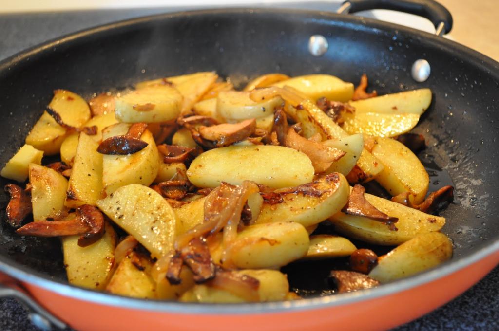 - Одновременное выкладывание на сковороду картошки и лука, грибов. Ошибка приводит к тому, что лук или грибы выделяют при нагревании жидкость, картофель размокает и не подрумянивается. Лук добавляют или до, или после картошки, а грибы и вовсе лучше пожарить отдельно, соединив с жареным картофелем на последней стадии приготовления.