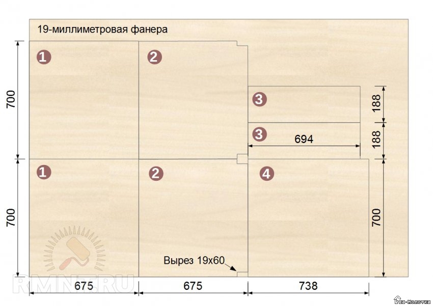 Детали каркаса: 1 — наружная боковая панель; 2 — внутренняя панель; 3 — задняя панель; 4 — основание