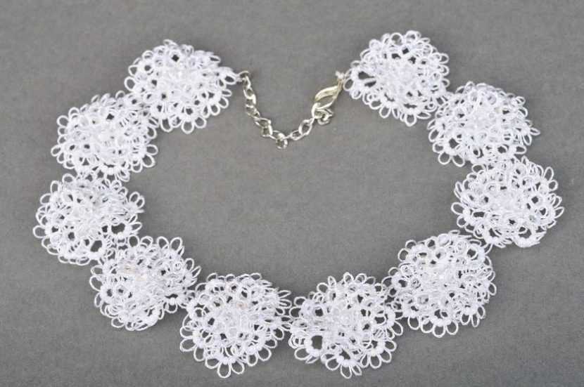 В среднем понадобится связать 13-15 элементов, после завершения работы колье можно зафиксировать простым английским замочком. Такое изысканное, но простое в исполнении, украшение можно дополнить бисером или бусинами. Колье станет идеальным штрихом для свадебного наряда.