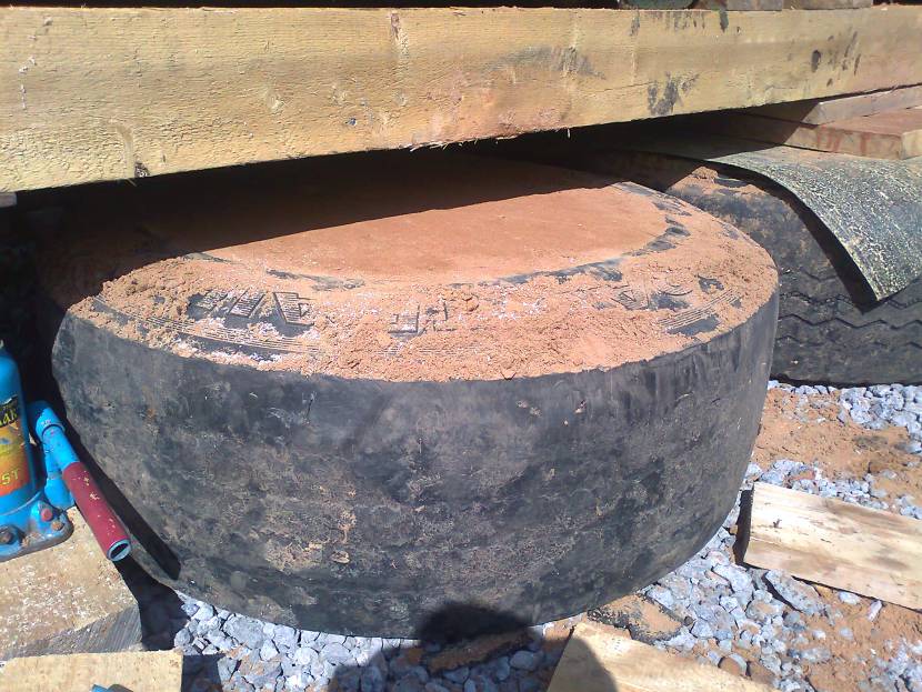 Такой фундамент представляет собой двухслойное, ровно уложенное основание из шин.