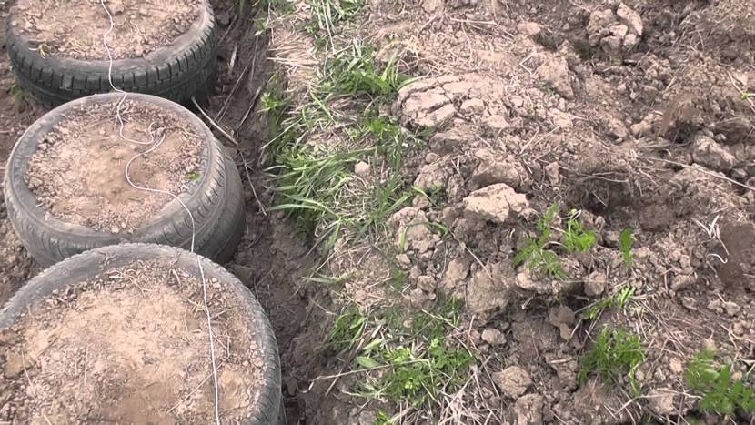Если используются большие тракторные колеса, то достаточно одного ряда покрышек в котловане. Применение шин намного меньшего размера потребует их укладки в два ряда. Также это необходимо сделать, если почва заболочена. И специалисты не советуют применять для засыпки пустот песок. Он дает значительную усадку.