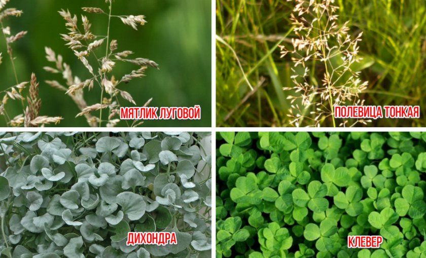 - Стержнекорневые газонные травы (рогатый лядвянец, синяя люцерна, красный клевер). Растения имеют пышные кусты, неприхотливы в уходе, красиво смотрятся в едином ковре лужаек.