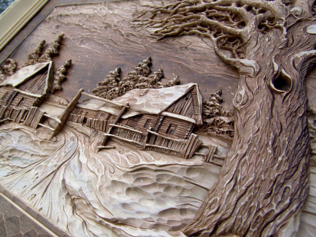 Все элементы рельефной резьбы размещены или выше, или на одном и том же уровне с фоновой поверхностью. Считается самым сложным видом резьбы. В данной технике создают разные выпуклые сюжеты и рисунки: эмблемы, гербы, животные и др. Причем значительную роль в изысканности законченного изделия имеет игра светотеней.