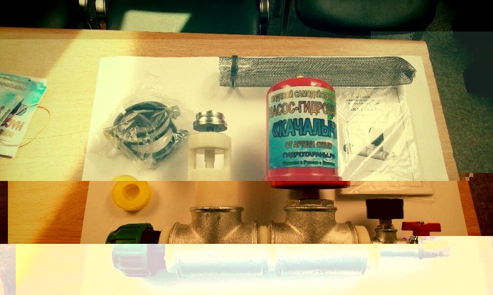 Для удобства работы с гидротаранным насосом на первый обратный клапан стоит установить дополнительный кран, хотя можно обойтись и обычной заглушкой. Пока она закрыта, вода через насос проходить не будет. На фотопримере ниже можно увидеть уже собранную конструкцию, на которой сверху установлен расширитель.