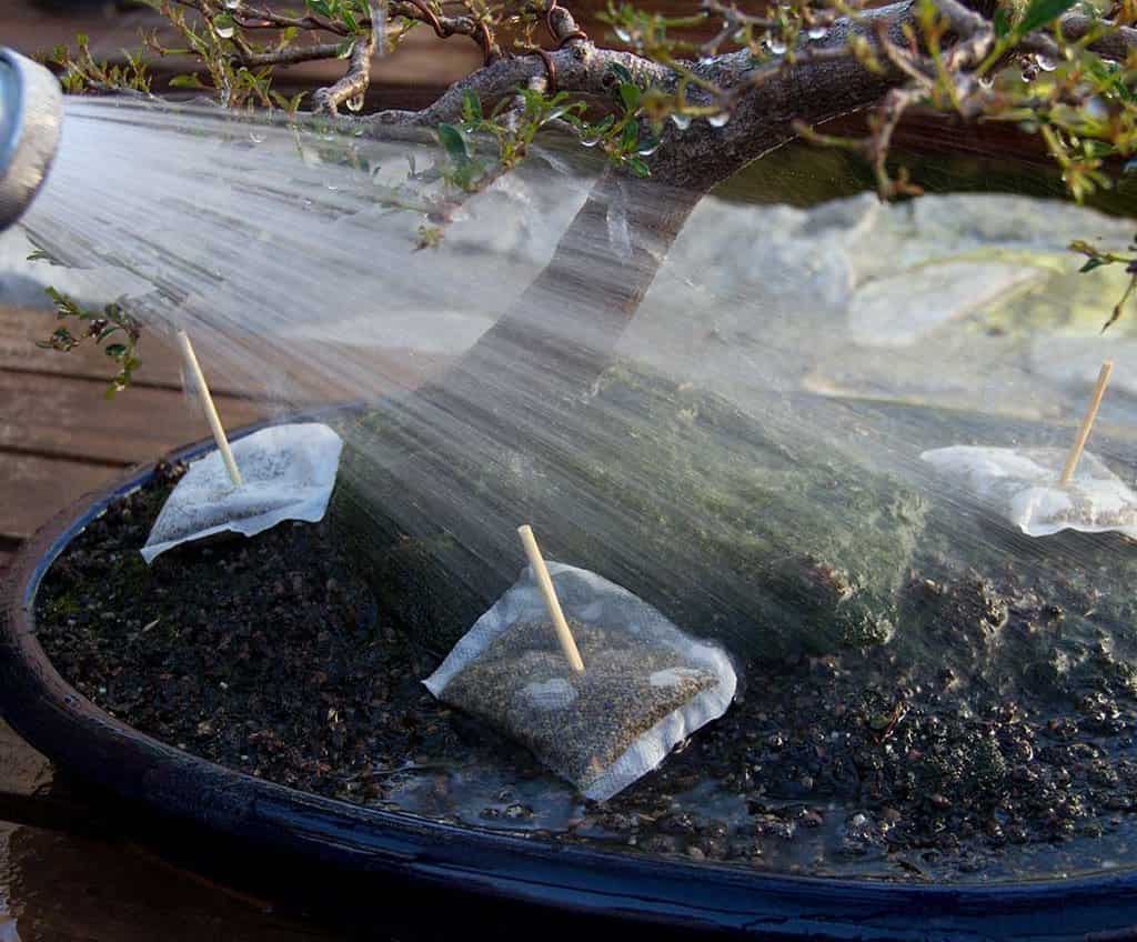 Zum Wässern hat sich die Methode des Tauchens als sehr einfach erwiesen. Es ist bei dieser Methode unbedingt erforderlich, dass die Bonsaischale eine Wasserablaufsöffnung hat. Dies sollte bei jeder Bonsaischale vorhanden sein.