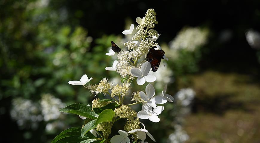 Цветение: с начала до середины лета. Большие белые или кремовые метелки, с возрастом становятся розовыми. Соцветия состоят из смеси крупных стерильных и мелких плодущих цветков.