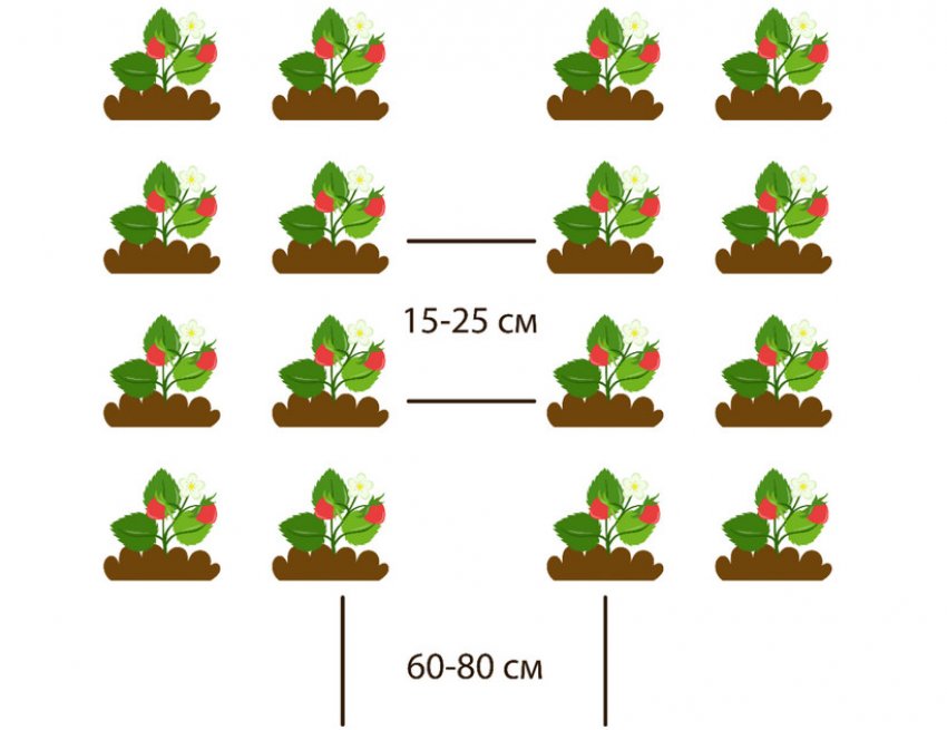 Суть метода в посадке кустов в два ряда — строки. При этом они должны быть посажены обособленно. В отличие от предыдущего метода, здесь не удастся посадить большое количество кустов, между ними должно быть соблюдено определённое расстояние. Однако плюс метода в том, что у кустов, посаженных в две строки, ягоды будут крупнее, чем при выращивании ковровым методом.