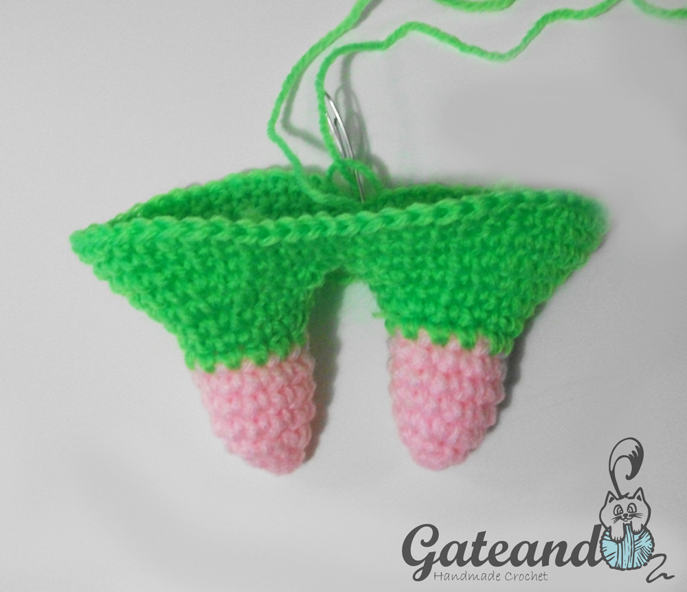 Нам потребуются нити семи цветов. Вяжем крышу, меняя цвет каждые 3 ряда. Получается вот такая чудесная кровля цвета радуги: