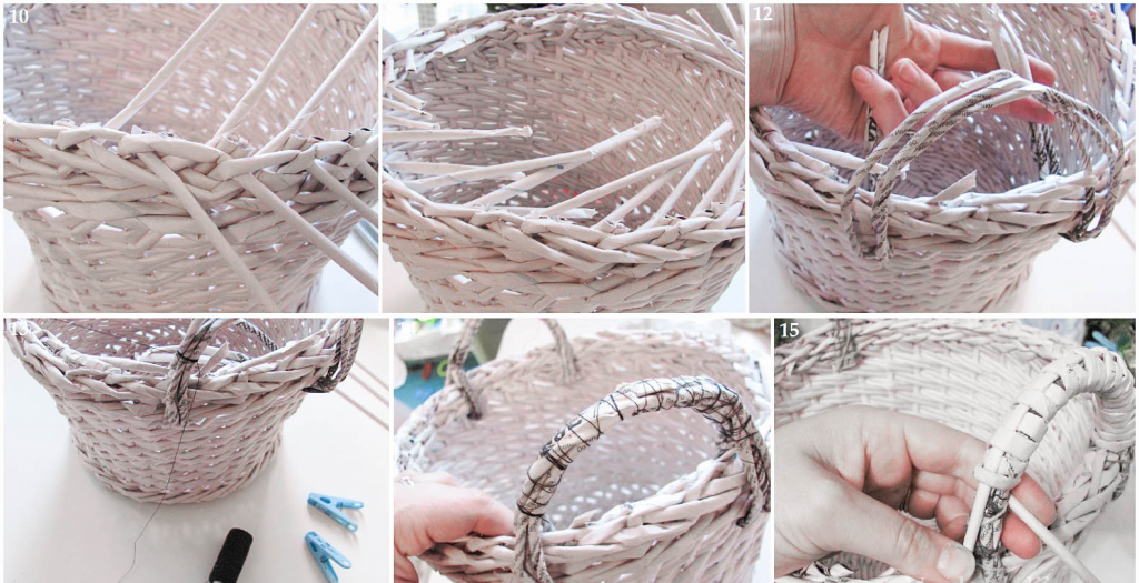 - Прежде чем удалить лишнее, стоит оставить по три трубочки друг напротив друга для ручки, если она была запланирована. Они соединяются между собой и оплетаются еще одной скруткой.