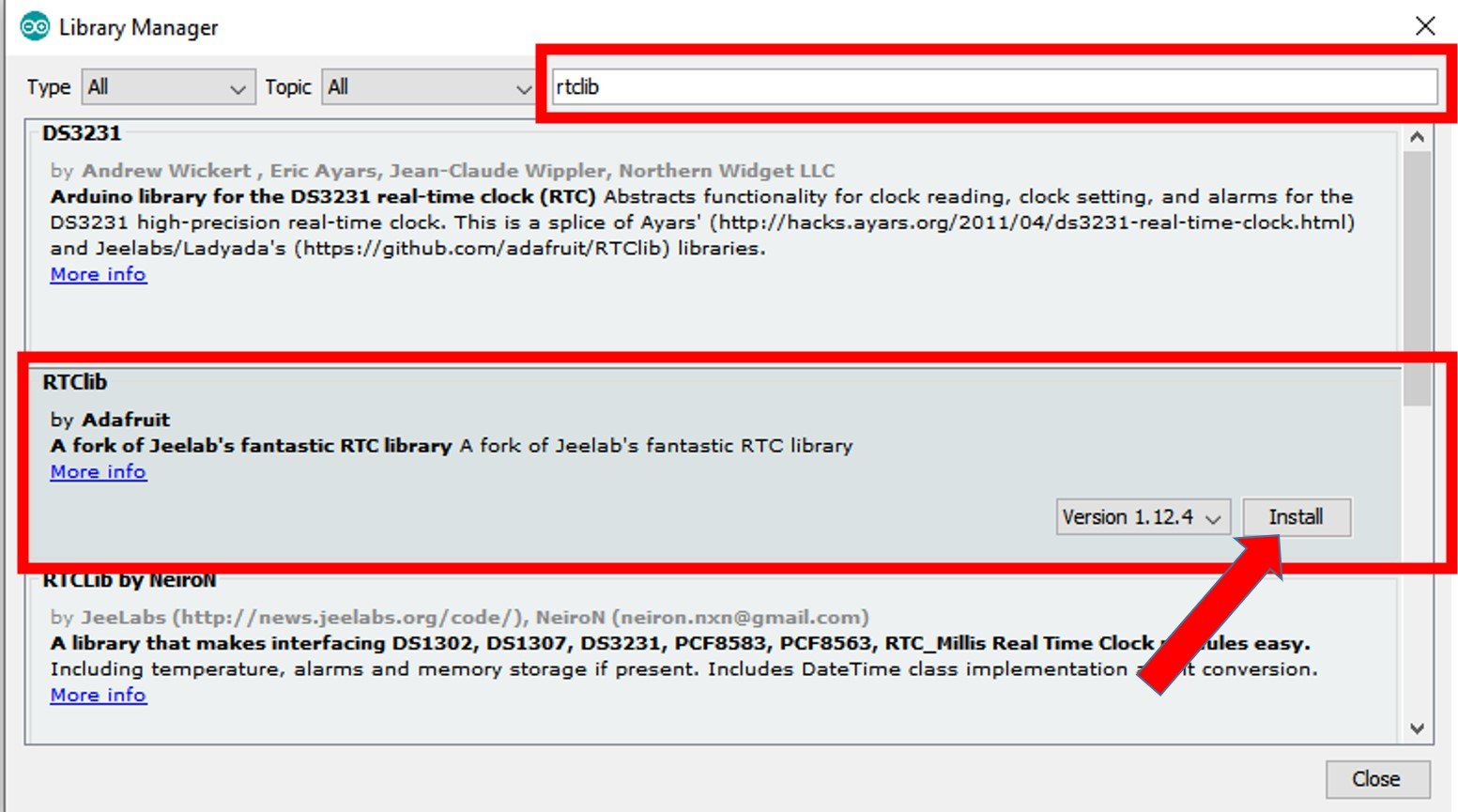 After that, this window library manager window will appear. Search for “RTClib” by typing in the search bar. You will see many options for DS3231. But the one that we will use in this tutorial is RTClib by Adafruit. Select RTClib by Adafruit and click on the install button.