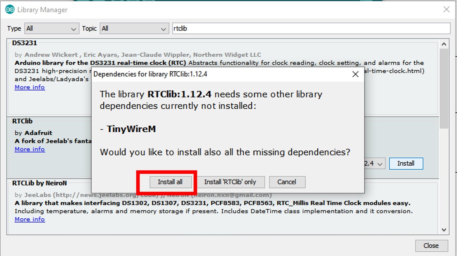 When you click on the install button, you may get a message that RTClib may require other libraries dependencies which is currently not installed in your Arduino IDE. We recommend you to install all dependencies by clicking on install button. Otherwise, RTClib will not work properly.