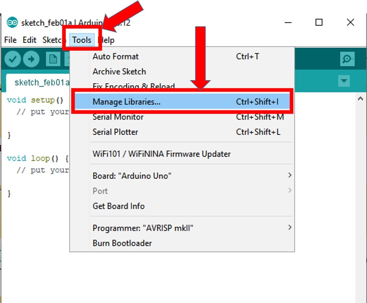 To use this library, first, we need to install this library in Arduino IDE by going to Arduino’s library manager. Open Arduino IDE, go to Tools > Manage Libraries.