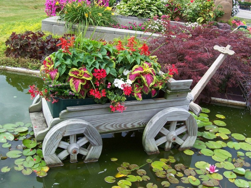 А если вы не готовы конструировать сложную вертикальную клумбу, но все равно хотите создать что-то красивое, то можно высадить растения в деревянную телегу или бочку. Такая клумба из подручных средств смотрится очень самобытно и становится настоящим украшением участка. При этом на то, чтобы сделать ее своими руками, вы потратите совсем немного времени.