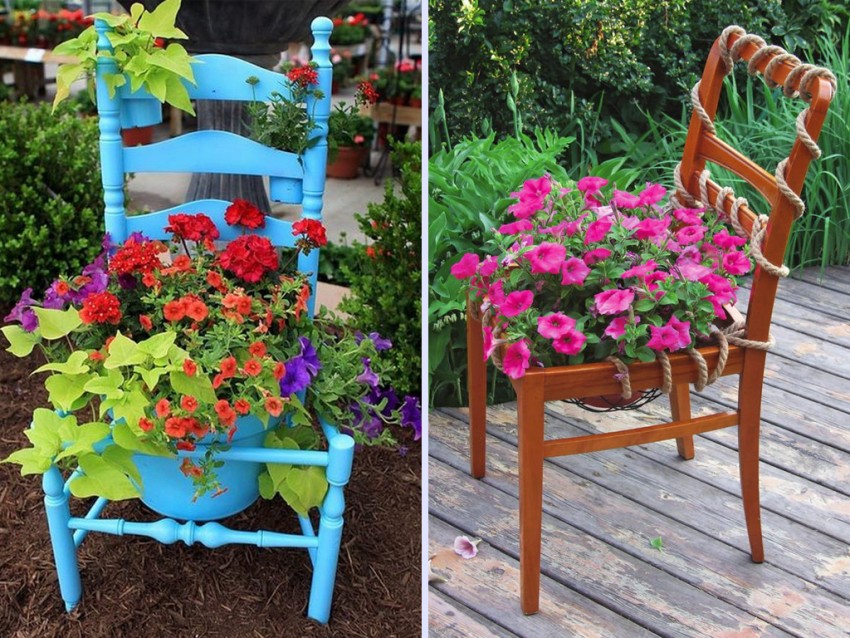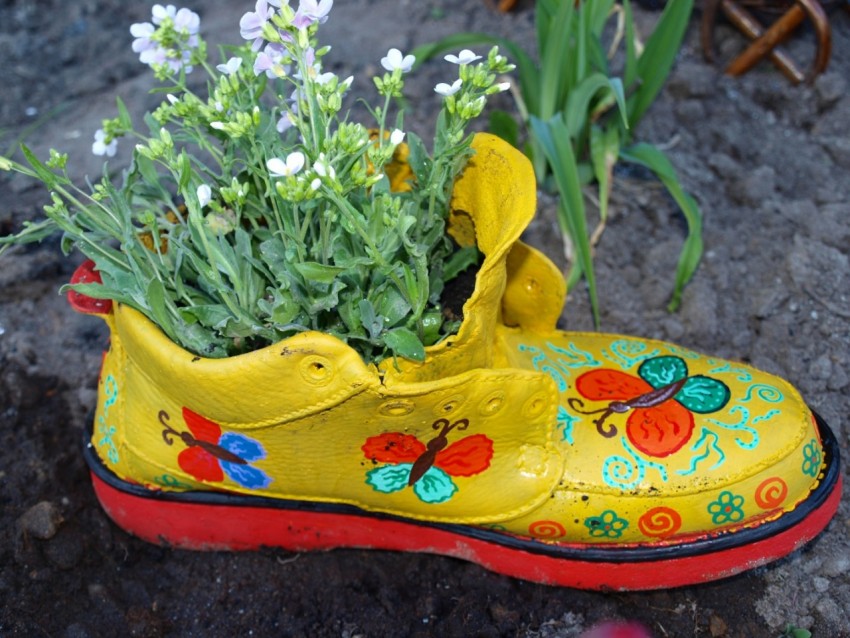 Самое первое, что делает каждая хозяйка для украшения дачи – посадка цветов. И здесь может пригодиться все – прохудившиеся емкости для воды, пришедшие в негодность предметы и вещи, старая мебель и даже одежда. Из подручных материалов можно соорудить и небольшие компактные цветники, и большие многоярусные клумбы. Все зависит от фантазии и возможностей владельцев.