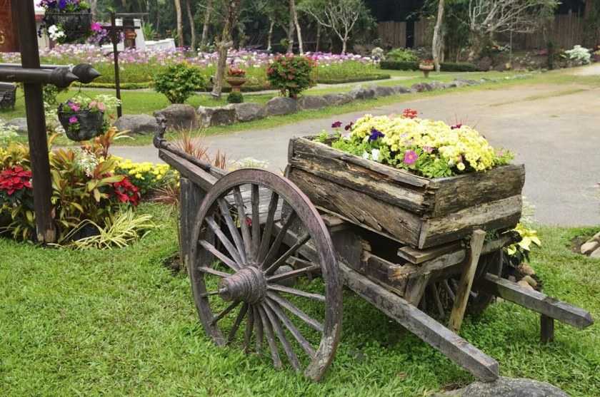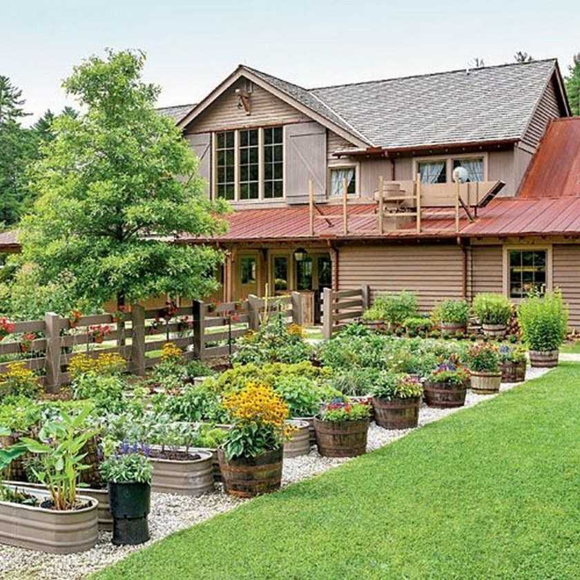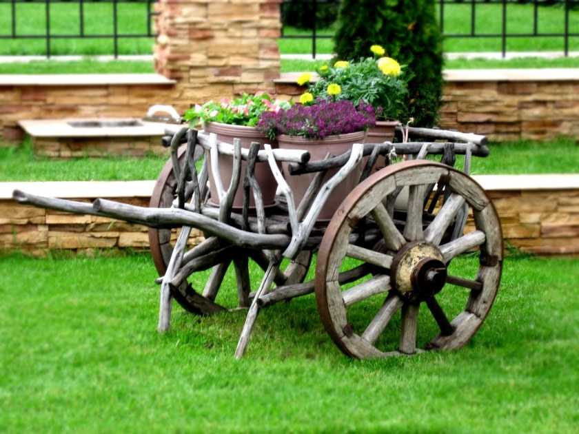 Он привлекает своей простотой и небрежностью. В оформлении используют неприхотливые цветы, композиции в деревенских мотивах. Старые деревянные колеса, цветы в деревянных тележках и бочках подойдут для декорирования в этом стиле. Такой стиль подойдет для дач любого размера, но уютнее будет смотреться он на участках с небольшой площадью (6-12 соток). Фото-примеры ландшафтных проектов в деревенском стиле иллюстрируют, насколько привлекательным он может быть.