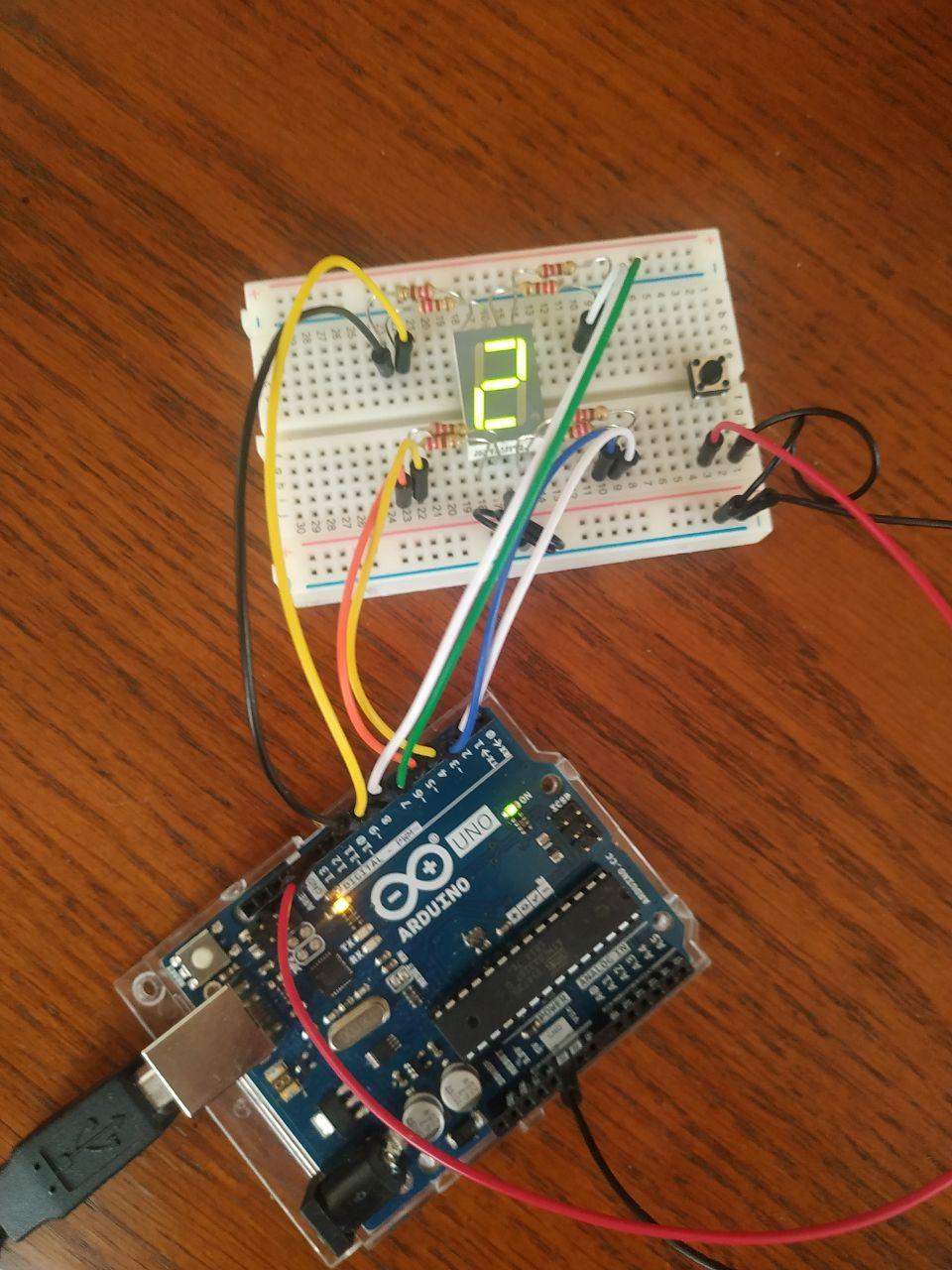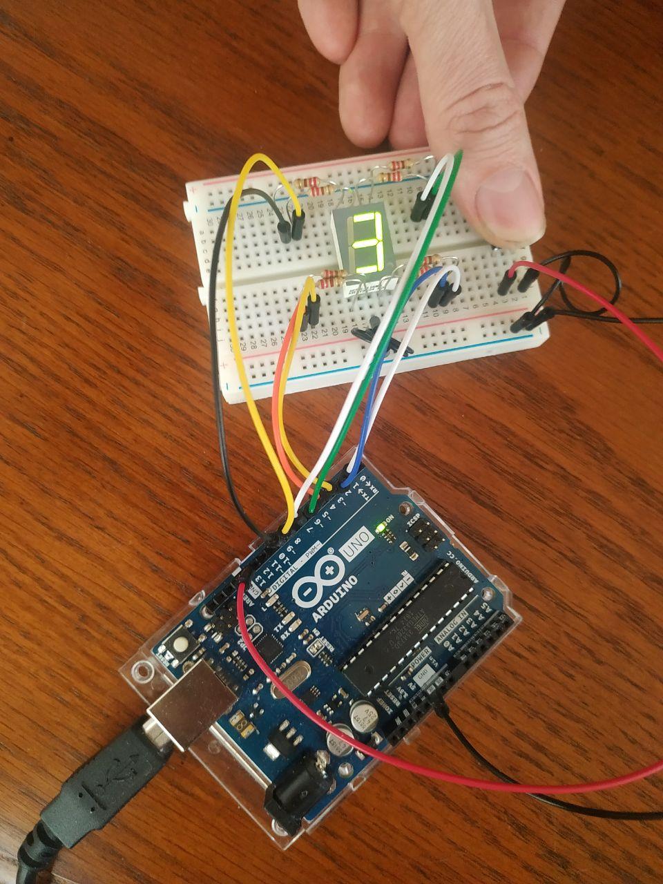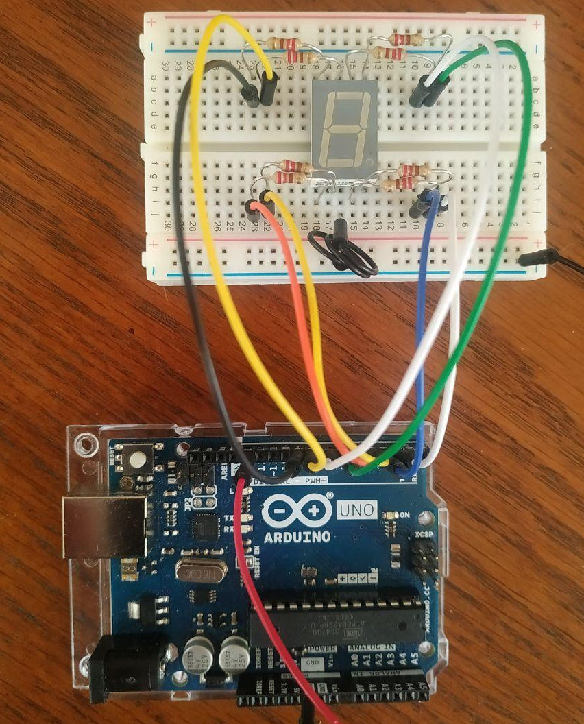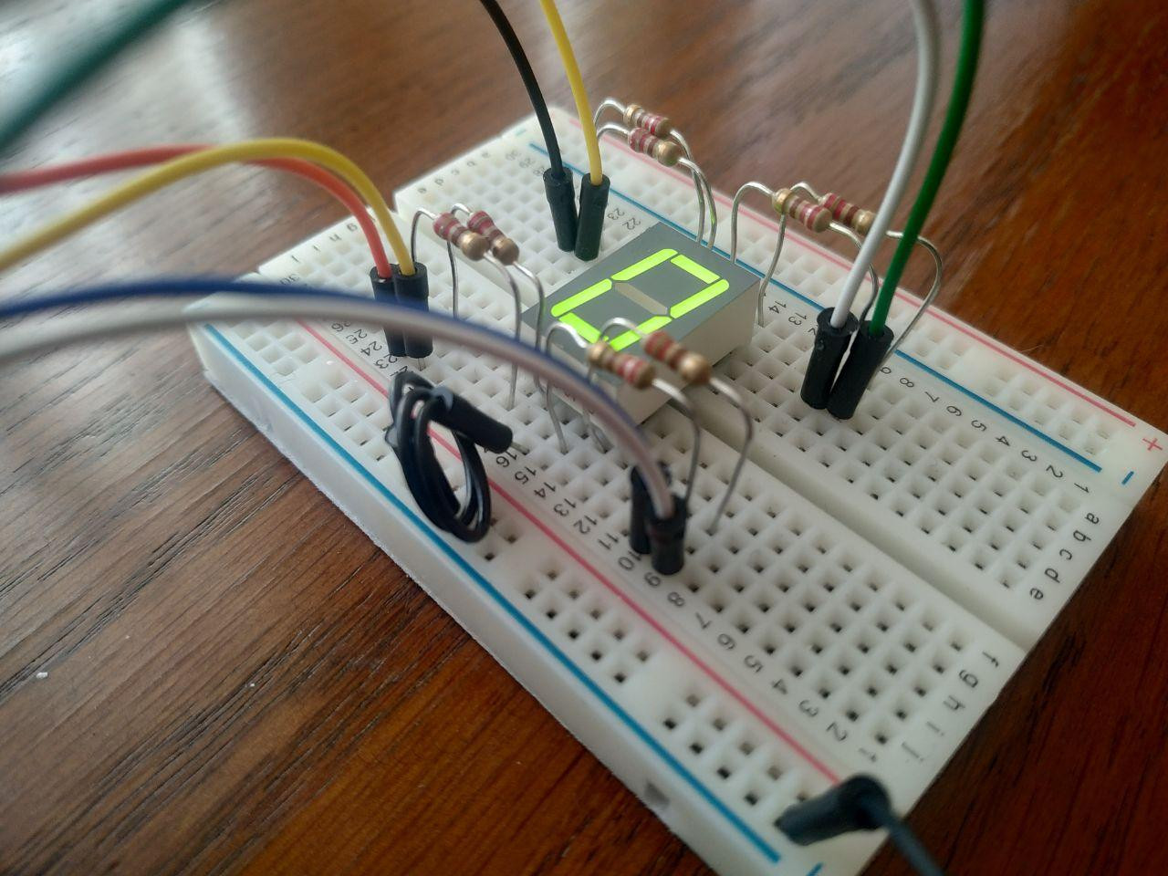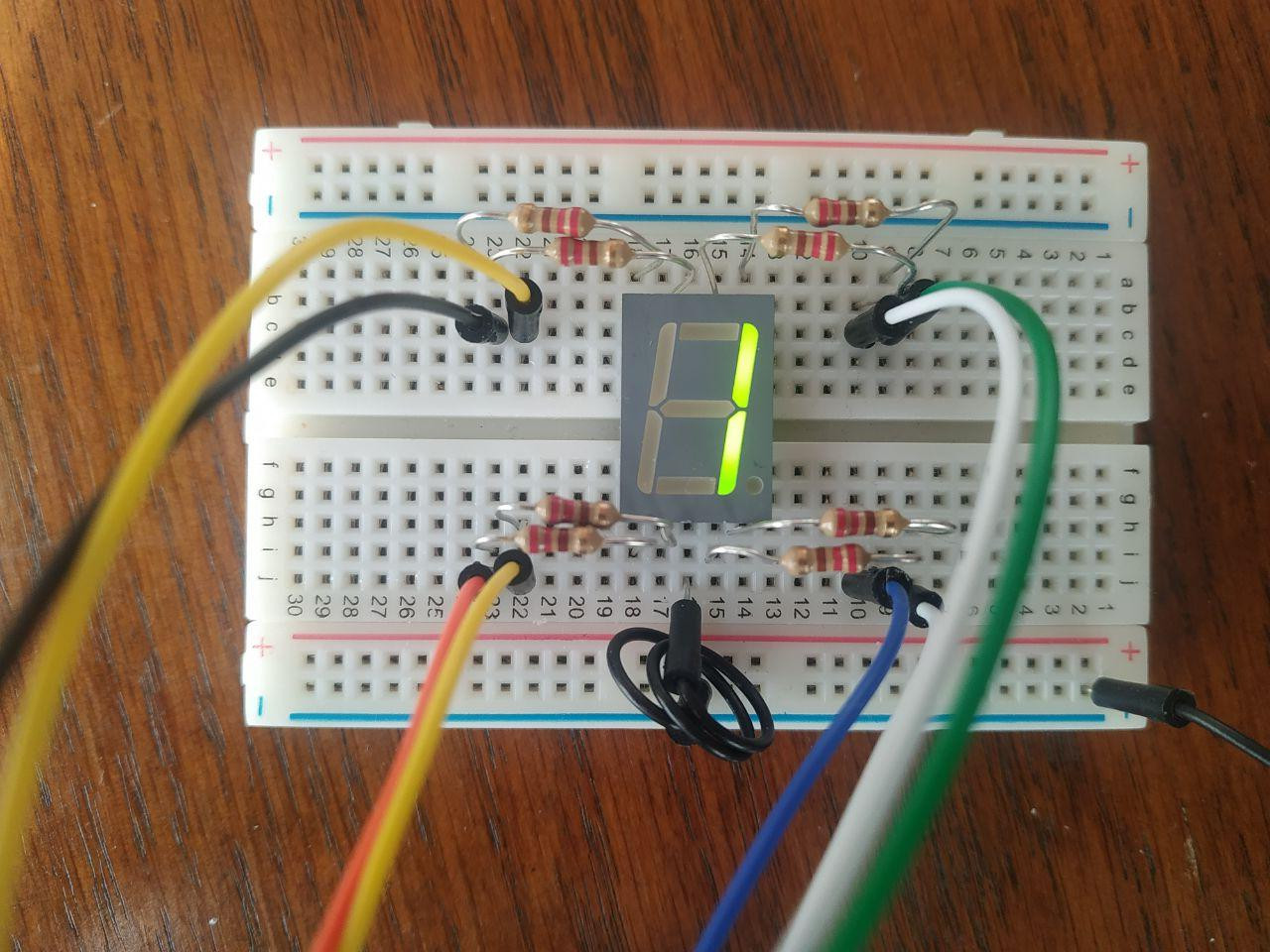 Чтобы вывести на экран цифру 1, нужно зажечь два правых сегмента. Они подключены белым и синим проводами к контактам 3 и 6. Изменю тестовую программу, чтобы она выводила на экран единицу.