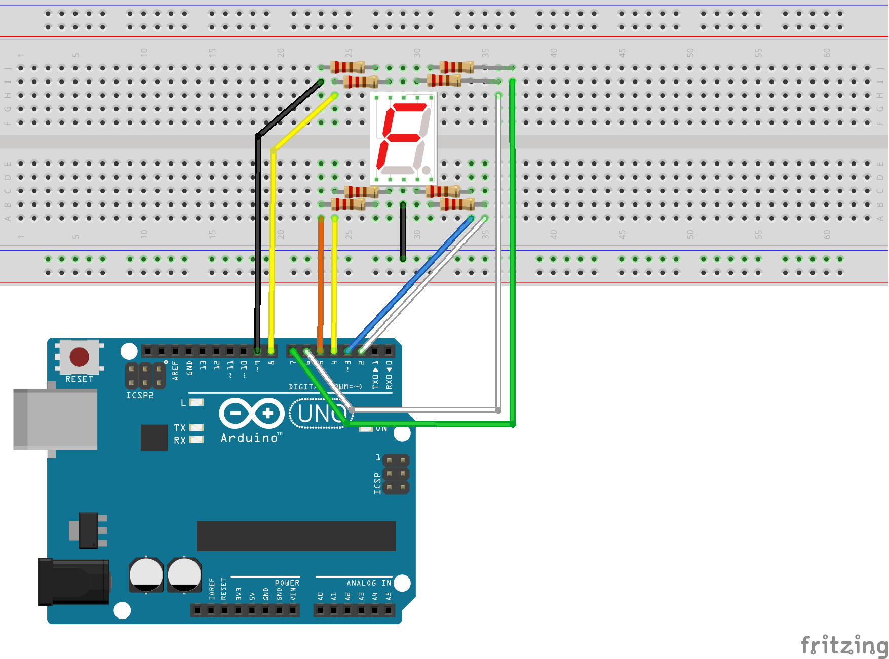 Пока индикатор зажигает отдельные сегменты, но чтобы вывести цифры нужно научиться зажигать комбинации. По принципу это напоминает заполнение почтового индекса. Попробуем вывести цифру 1. Для этого нужно определить, какие сегменты зажигать. Посмотрим схему подключения более внимательно.