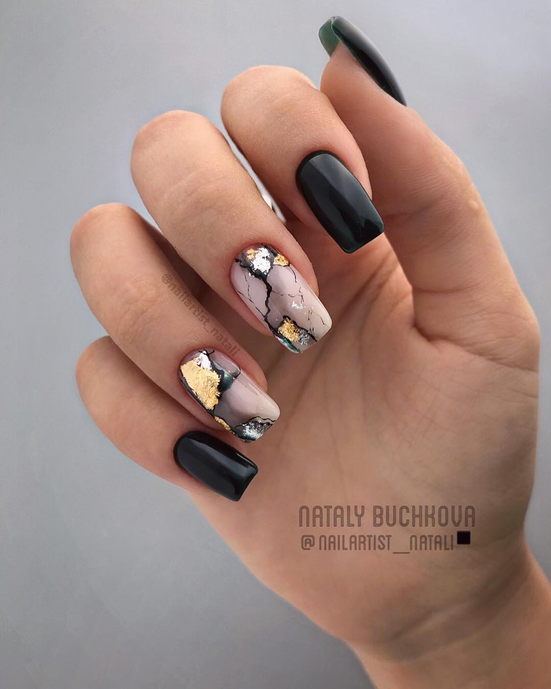 Также интересное сочетание матового топа с глянцевым. Черный как нельзя лучше передает всю красоту мраморного камня. Белые прожилки хаотично расположенные по ногтю прекрасно сочетаются с черным основным цветом. А если черный дополнить золотым лаком, можно получить поистине королевский дизайн. Черный мрамор дополнит ваши повседневные наряды. Такому элегантному маникюру свойственно выглядеть красиво и достаточно универсально.