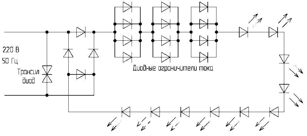 Кремниевый диод выполняет функцию защиты от перенапряжения. Если он отсутствует, при отрицательной полуволне U на запертом светодиоде будет падать 220 В или 380 В. Большинство светоизлучающих диодов не рассчитано на такое обратное напряжение. Из-за этого может произойти пробой p-n перехода LED. При встречно-параллельном подключении кремниевого диода, во время отрицательной полуволны он будет открыт и U на светодиоде не превысит 0,7 В. LED будет надежно защищен от высокого обратного напряжения.