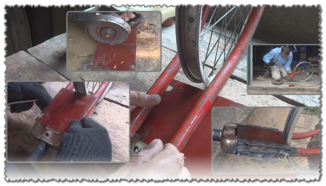 К вилке нужно приварить две трубы, которыми будет осуществляться управление прополочного агрегата. Главное, что нужно соблюсти – это горизонтальное положение вилки от велосипеда.