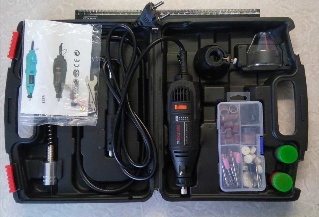 Компактная дрель с уймой насадок для филигранных работ. В комплекте есть набор для шлифовки, сверления, фрезерных работ, заточки и нанесения гравировки. Общее число насадок превышает 50 единиц.