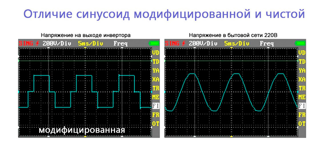 Это означает, что там совсем не синусоида, а разнополярные прямоугольные импульсы, которые следуют с определенной паузой. Ниже на осциллограммах показаны синусоидальная форма напряжения в бытовой электросети (слева) и осциллограммы так называемой «квазисинусоиды», снятые с разных устройств.