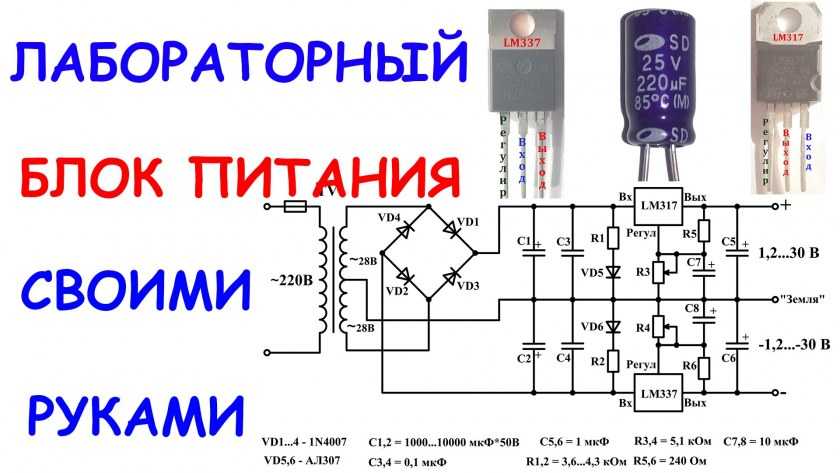 Схема сборки мощного лабораторного блока питания с возможностью регулировки выходного напряжения. В этом случае силовые элементы выставляются внизу корпуса, конденсатор необходимо разместить между диодным мостом и трансформатором.