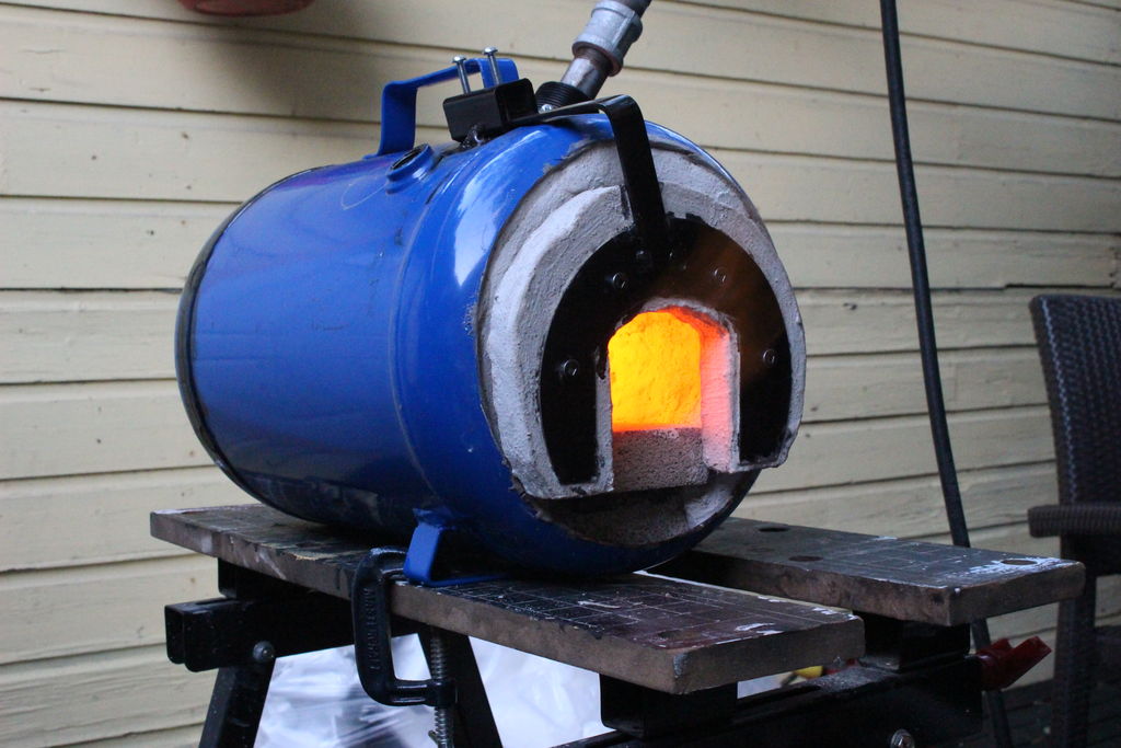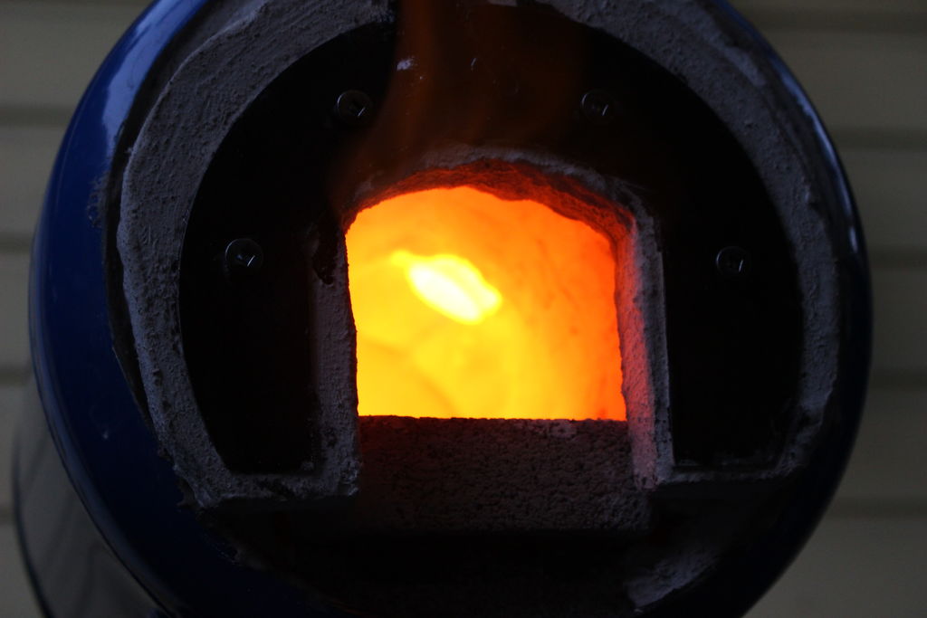 Горелку ставим в нижнюю часть, напротив вверху идёт труба на улицу. Остальное заглушить. Настройки на минимальный расход и можно отапливать гараж. В закрытом пространстве работает хорошо и в теории на оптимальных настройках даст температуру около 1200 градусов. Этого за глаза хватит для плавки алюминия, латуни, бронзы, свинца, закалки и отжига клинков для ножей. Можно ковать заготовки из напильников. Применений масса.