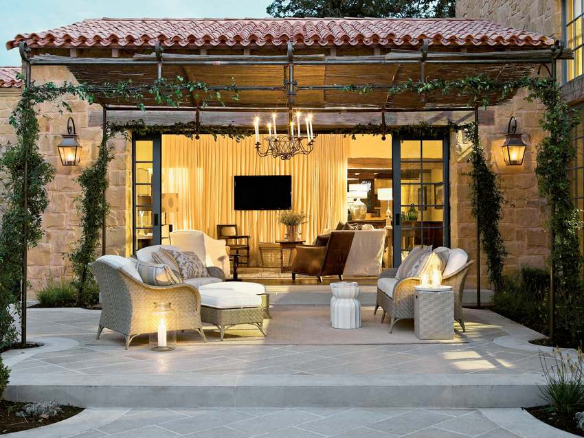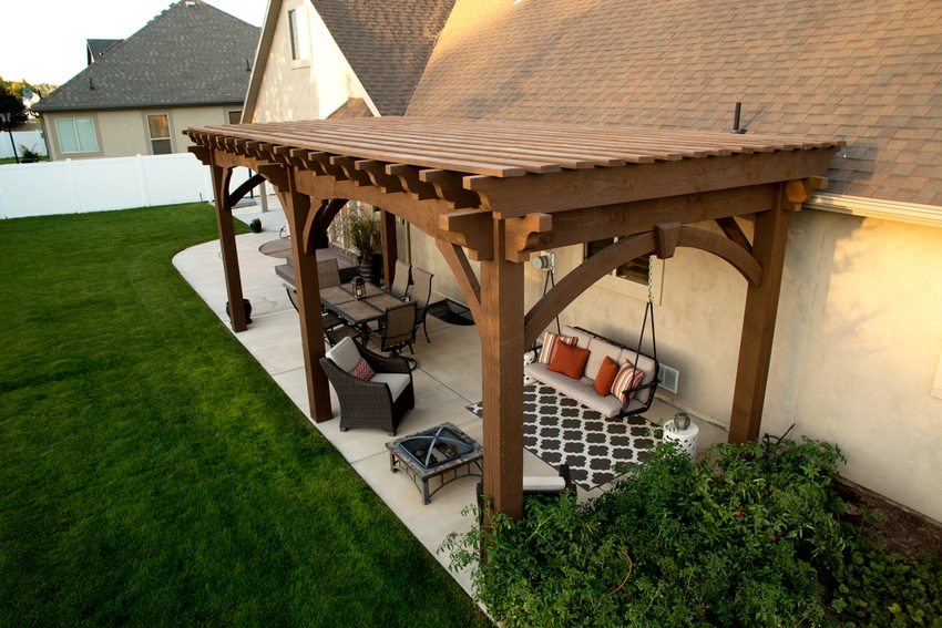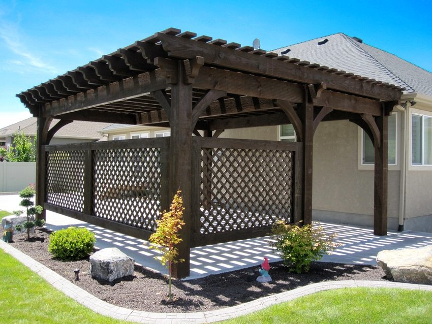 Деревянные решетки будут эффектно смотреться при дизайне навеса в стиле “эко”