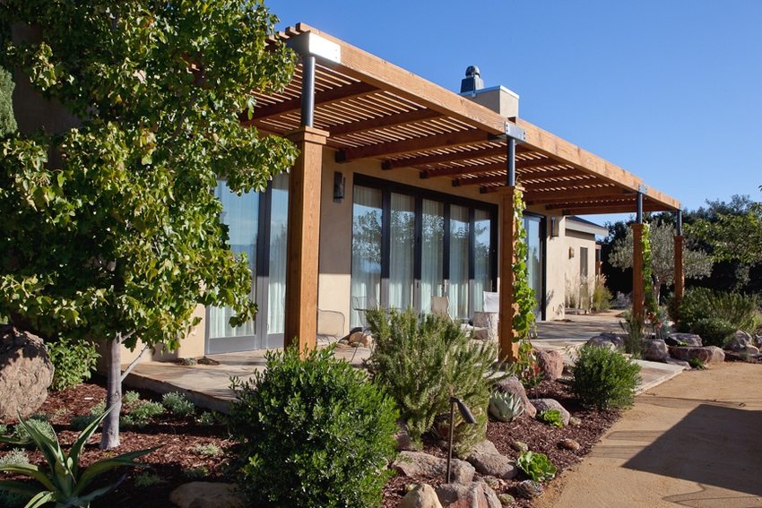 Один из ответственных этапов сооружения деревянных навесов к дому – выбор материала конструкции. Подойдет любой вариант, но при возможности постарайтесь использовать сосну. Дерево для сооружения этого вида отличается хорошими показателями долговечности, небольшим весом и приятным внешним видом.