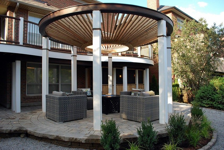 Навес во дворе частного дома, выполненный в форме арки