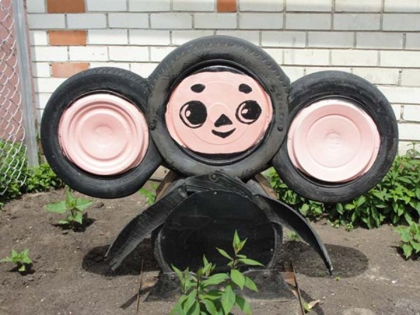 Для создания используются шины легковых автомобилей. В две автопокрышки вставляем фанеру, которую прикрепляем саморезами. Основу выкрашиваем в темно коричневый цвет. Фанеру внутри покрышек выкрашиваем более светлым колером. Автопокрышки со вставками скрепляем между собой. Устанавливаем вертикально на автошину положенную горизонтально. Вырезаем из фанеры уши, скобами крепим на голове фигурки. Красками наносим элементы лица Чебурашки.