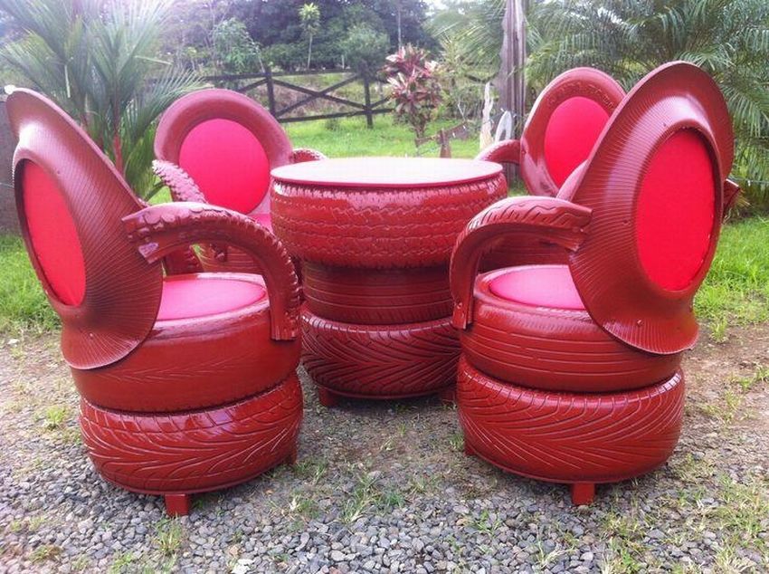 Обтянутые автопокрышки подарили новую жизнь вышедшим из пользования предметам.