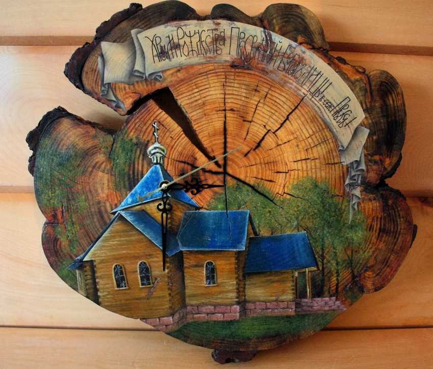 Для этого потребуется на рогожку наклеить спилы впритык друг к другу, перевернуть изделие и произвести такое же наклеивание с обратной стороны. Воспользовавшись красивым спилом бревна, некоторые умельцы изготавливают часы, закрепив с обратной стороны механизм, который ранее стоял на электронных часах и просверлив в центре углубление для стрелок. Используя возжигатель, рисуют циферблат или же наклеивают несколько палочек из дерева на места, где должны быть цифры.