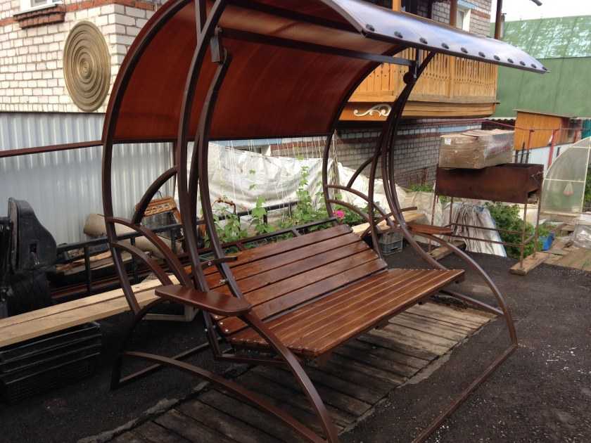 Сложной конструкцией считаются качели из доски и бревна семейного или взрослого типа, где дополнительным сооружением предусмотрен навес. Пошагово процесс состоит из следующих этапов: